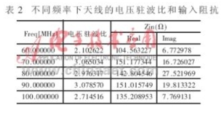 從文獻中可以查到本文所仿真的天線輸入電阻值約為150Ω,從文獻可以查到輸入電抗約為20Ω左右。實際上,不僅天線的輸入電抗與頻率有關(guān),而且不同頻率下輸入電阻也不同,利用仿真軟件可以比較準確地得到這些參數(shù)。表2給出了幾種頻率下天線的輸入電阻與電抗值。從表2可以看出,仿真結(jié)果的輸入阻抗在工作頻帶內(nèi)與理論值有一定差別,隨著頻率接近天線頻率范圍的上下限,仿真結(jié)果與理論值相差越大。通過仿真計算所得到比較準確的天線輸入阻抗,對于研究調(diào)制電路與天線的匹配問題有著非常重要的作用。