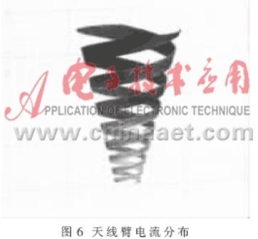 圖6表示頻率f=80MHz時電流在天線臂上的分布,可以看出傳導(dǎo)電流從天線饋電點(即圓錐頂部一端)流入,先經(jīng)過傳輸區(qū)(約下面的2圈),再向上是輻射區(qū)(約第3圈),最后為衰減區(qū)(后面幾圈)。在傳輸區(qū)內(nèi),電流大小變化不明顯,到達輻射區(qū)后,隨著大量能量以電磁波的形式傳播,電流迅速減小,最后經(jīng)過衰減區(qū),電流逐漸減小至零,這符合天線一般規(guī)律。其中,輻射區(qū)的位置與頻率有關(guān),即位于波長近似于圓錐截面周長的地方。可以想象,不同頻率會對應(yīng)不同的輻射區(qū)位置,這是CLS天線的工作特性,也是CLS天線具有寬帶特性的原因。