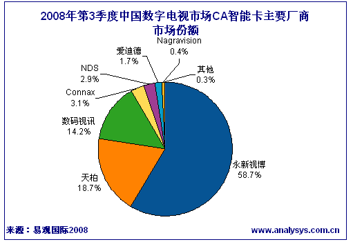 易觀國際近期發布《2008年第3季度中國DTV市場季度監測》數據顯示,2008第3季度中國有線數字電視累計用戶達到3973萬戶,環比增長9.5%,增長速度放緩。CA卡發卡量達358萬張,環比下降43%。