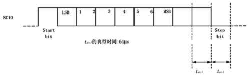 此時(shí)約過3ms,SCIO開始輸出數(shù)據(jù),第一個(gè)Byte即為STARTByte,總共輸出14Bytes數(shù)據(jù)。見圖6.