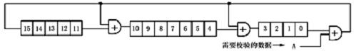 本文采用的CRC-CCITT,能檢測(cè)出所有的雙錯(cuò)、奇數(shù)位錯(cuò)、突發(fā)長(zhǎng)度不大于16的突發(fā)錯(cuò)以及99.997%的突發(fā)長(zhǎng)度為17的突發(fā)錯(cuò)和99.998%的突發(fā)長(zhǎng)度大于或等于18的突發(fā)錯(cuò)。CRC校驗(yàn)碼的數(shù)學(xué)原理本文在此不作介紹。本文在這里說(shuō)明怎樣實(shí)現(xiàn)CRC校驗(yàn)。CRC校驗(yàn)碼的運(yùn)算可以用移位寄存器和半加器來(lái)實(shí)現(xiàn)。如附圖8所示。