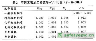由Benson和AILison對各種不同工藝加工的口徑為25.4mm×12.7mm銅波導管,測出KT1,KT2,Kp之后,據上式算出的α′/α之值見表2[1]。[page]