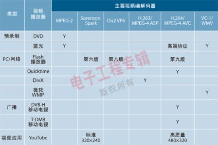 正如表1所示那樣,許多應用都有向H.264視頻標準轉變的趨勢,因為H.26?具有很高的編解碼效率。H.264標準具有廣泛的協議以適用于從低分辨率視頻會議到HDTV等各種類型的應用。為了最大化兼容性,移動設備應支持H.264基線協議(Baselineprofile)以及運算能力更強的主要協議(Mainprofile)和高端協議(Highprofile),后者使用更高效率的CABAC(內容自適應二進制算術編碼)無損壓縮技術。H.264高端協議在指定比特率下可以提供更高的質量,是高清藍光盤首選的視頻編解碼標準。