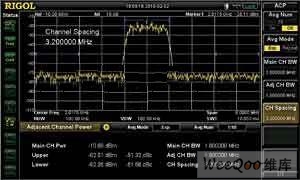 對于問題一和問題二可以采用DSA1030A頻譜分析儀中的ACP鄰道功率測量和OBW占用帶寬測量來解決。領道功率測量可以測量主道功率、前一信道和后一信道的功率、以及主道與上下鄰道之間的信噪比測量,圖1中左下方為測量結果。用戶根據特定的需要靈活設置主道帶寬、鄰道帶寬以及主道和鄰道之間的間距的大小,圖1中右下方為測量設置值。通過利用領道功率測量的功能可以清楚地測出通道通信的能量大小以及通信的信噪比。從圖1可以得出主道能量為 -10.69dBm且基本上集中在1.6MHz的帶寬內,符合TD-SCDMA信號每個載波的帶寬為1.6MHz的要求。鄰道抑制為-51.32dB和 -51.66dB,可以滿足一般的需要。