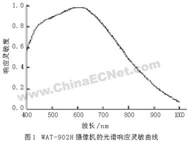 獲得的圖像質量直接影響圖像處理程序的復雜度和檢測結果。如果采用的光源單色性越好,越接近平行光,則圖片的干涉條紋更清晰,質量更好。然而單色激光器或者平行光源體積大,而紅外測試系統的一大特點就是結構簡單、緊湊,而提供窄波段的照明價格比較昂貴,且不易控制,因此選用普通的白熾燈作為光源。為了得到較好的紅外圖片,在鏡頭的上方放置一塊雙面鏡面拋光的硅片,從而過濾掉可見光對圖片的影響。同時,選用超低照度黑白攝像機WAT-902H,它的光譜響應靈敏曲線如圖1所示。而紅外線波長為750 nm~1000μm,這樣我們采用普通的光源就可以獲得窄波段的紅外圖像。另外,由于該相機對紅外波段的響應靈敏度不高,可以通過增加光強來克服,從而獲得清晰的紅外干涉圖像,為后續的圖像分析和處理做準備。