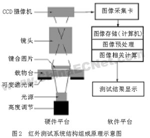 光源通過可變光闌照射到鍵合片,光線透過鍵合片,通過鏡頭,在攝像機上成像,從而獲得鍵合片的紅外圖像,通過數據采集卡送入計算機,經過圖像處理程序的處理,顯示測試結果。