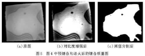 該檢測儀更具有靈活性和實用性,不但可用于同質材料鍵合片的質量檢測,還可用于異質材料鍵合片的檢測,用于篩選適合下一步工藝研究的合適鍵合片等。同時,該檢測儀結合到鍵合裝置中,可以實時觀測鍵合過程中鍵合的動態圖像,觀察鍵合波,實時指導鍵合工藝。但目前已實現的軟件功能還很簡單,只能進行鍵合質量的初步評估。要獲得鍵合片的更多信息,需要添加軟件功能,這是該系統的不足之處和值得改進的地方。