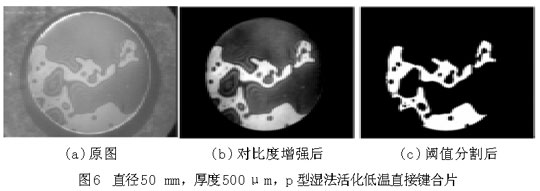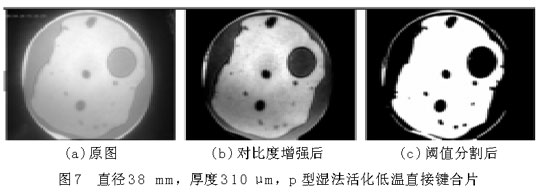圖6(a)和圖7(a)中,圓形區域是要鍵合的圓片,其中明區為鍵合上的地方,暗區為未鍵合上的地方,圓形區域(即鍵合圓片)以外為圖像背景。從圖上可以大致地看出空洞(未鍵合區域)的分布、個數和大小等。為了獲得更為準確的數據信息,借助圖像處理程序對圖片(a)進行對比度增強、平滑、分割等一系列處理,可獲得圖(b),(c),從而得到鍵合率。樣品1的鍵合率為28.12%,鍵合率很低,并且從圖6中空洞的分布可以看出,樣品1鍵合得很不好。樣品2的鍵合率為66.12%。比較圖6和圖7,樣品2的鍵合質量明顯優于樣品1,可以說明鍵合圓片越薄,越容易鍵合。可以從平板理論理解這一鍵合現象,圓片越薄,界面表面能克服圓片翹曲貼合到一起所需要的力越小。