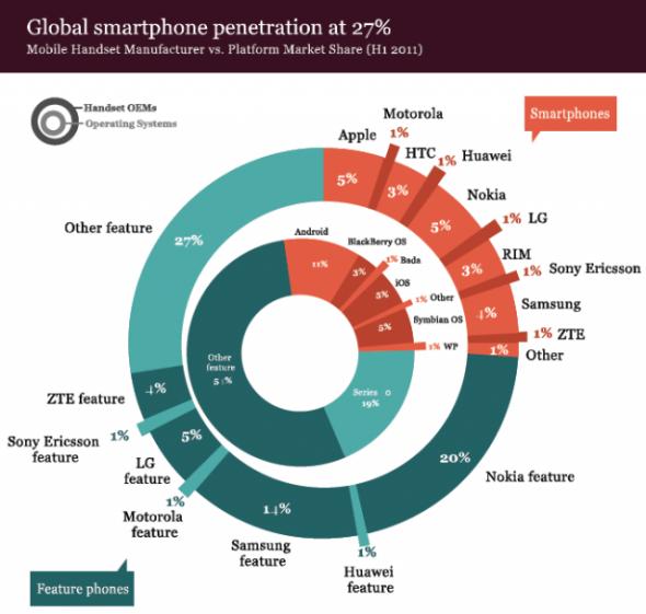 近日消息,移動戰略公司VisionMobile今天發布研究報告稱,全球多數用戶仍在使用功能手機來打電話和獲得數據。報告顯示,雖然2010年和2011年智能手機出貨量大幅增長,但全球智能手機滲透率仍舊僅為27%。