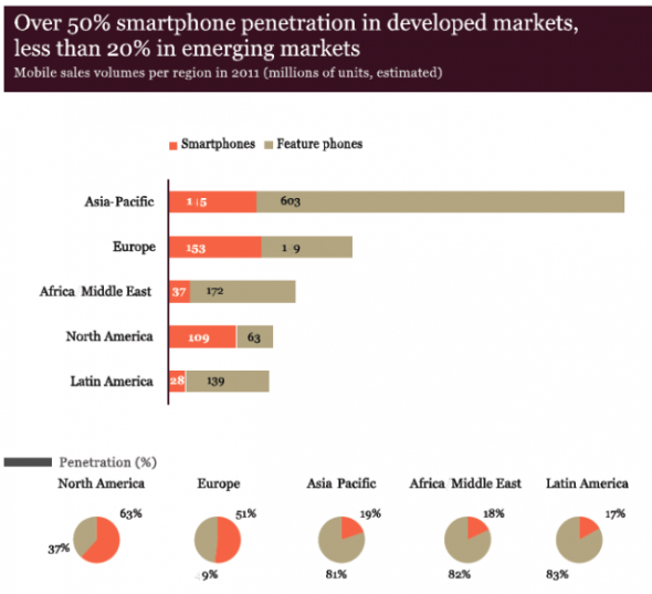 在北美和歐洲市場上,智能手機滲透率是最高的,在各自市場上所占份額分別為63%和51%。相比而言,亞太地區、非洲和中東地區、以及拉美地區,滲透率則要低得多,依次分別為19%、18%和17%。