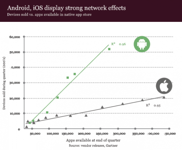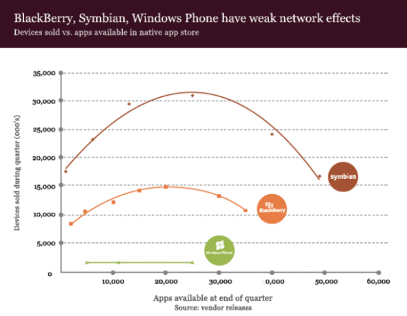 一件有趣的事情是,從手機應用這方面來看,所有排名靠前的智能手機廠商的網絡效應都能表明其產品的受歡迎度。以上圖表顯示的是某一特定時間點在某一特定平臺上的應用數量,以及這一時間點以前的一個季度中該平臺的手機出貨量數據。由此得出的圖表證明Android和iOS備受歡迎,同時也表明對于另一個競爭對手來說,想要成為第三大平臺有多么困難。