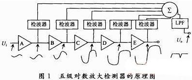 射頻信號檢測的實質(zhì)是如何實現(xiàn)將功率信號無失真地轉(zhuǎn)換成電壓信號,而這個轉(zhuǎn)換工作則由對數(shù)放大檢測器來完成,因此,對數(shù)放大檢測器是射頻測量的關(guān)鍵。它的核心是對數(shù)放大器,對數(shù)放大器之間采用直接耦合方式,分成N級,每級由對數(shù)放大器和檢波器組成。每級的輸出送到求和器,由求和輸出經(jīng)低通濾波器后得到一個電壓信號。N一般取值為5~9級,級數(shù)越多,單級增益越小,則輸出特性曲線越趨向于線性,這里以5級為例進行分析,具體電路如圖1所示。
