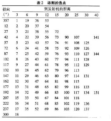 覆蓋測試是根據特定的半徑和幅角在圓周上進行選點的,這些測試點的選擇總共包含18個不同幅角(12,27,42,58,72,87,102,117,132,147,162,177,182,207,222,287,300,357),對應于以發射機為圓心的3,6,9,12,15,20,25,30和40 km這幾個半徑上。選點是出于幅角的考慮,展現了至少45 dBμV/m內的場強估計,并根據地形信息通過算法得到有用信息。圖2展示了場測選點的地形分配,測試點的具體參數,如表2所示。