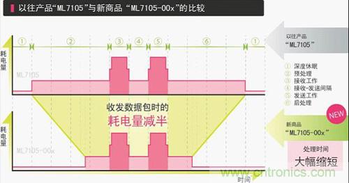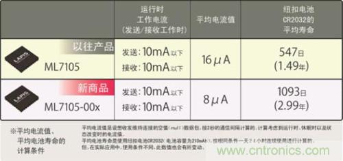 LAPIS Semiconductor去年推出的“ML7105”,實(shí)現(xiàn)了業(yè)界頂級(jí)的低耗電量(收發(fā)數(shù)據(jù)包時(shí)的運(yùn)行狀態(tài))。此次開(kāi)發(fā)出的新品“ML7105-00x”,不僅保持了運(yùn)行狀態(tài)下的低耗電量性能,而且平均電流還減少了一半。所謂平均電流,是指按一定間隔反復(fù)收發(fā)數(shù)據(jù)包時(shí)的運(yùn)行狀態(tài)(耗電量大)與休眠狀態(tài)(耗電量小)的平均電流值。通過(guò)大幅減少改變狀態(tài)所需的時(shí)間,使平均電流減半,從而使電池壽命可達(dá)2倍。因此,按LAPIS Semiconductor的工況條件,支持Bluetooth® Low Energy的、使用紐扣電池(CR2032)的設(shè)備其電池壽命即使在24小時(shí)連續(xù)工作的條件下,也可充分使用2年。
