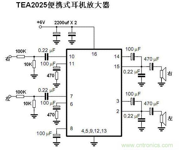 3,TEA2025使用手冊(cè)上推薦的線路,是作為小型功率放大器的應(yīng)用,電壓增益高達(dá)52分貝,不適合直接做耳放。我在它的第6,第11腳對(duì)地串入了470歐姆的電阻以降低增益。