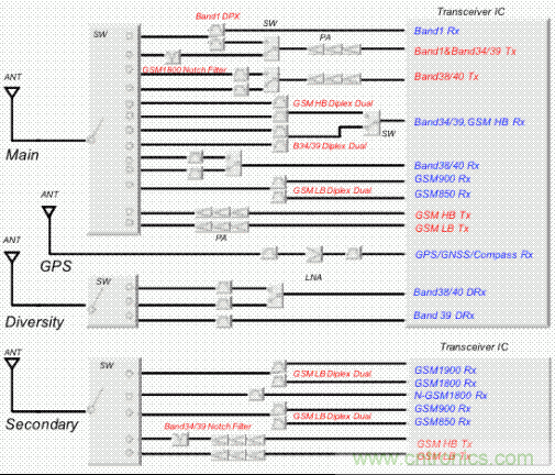 現(xiàn)在的TD-LTE對應(yīng)終端,為了對應(yīng)語音通話,三重模式和雙模式的GSM和UMTS是必不可少的。GSM就預(yù)見到了海外漫游的這個問題,因此一般能對應(yīng)850MHz、900MHz、1800MHz、1900MHz四個不同頻帶,在接收側(cè)的每一個頻帶上都逐個搭載了濾波器。UMTS的band1為FDD,所以需要雙工器(天線雙工器)。
