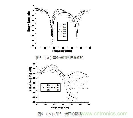 圖6給出了該相控陣前六個激勵端口的仿真回波損耗和和前七個天線的相鄰單元的耦合系數曲線。可以看出,各個端口匹配良好,且互耦隨著間隔的增大而較小。