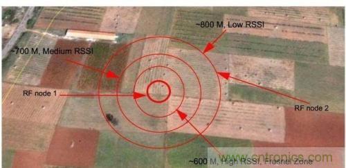 現在,我們將節點2替換為增益(輸出功率)為0dB的MRF24J40MA模塊。由于節點1的接收靈敏度為-95dBm,故衰落余量為 35dBm(95dB~60dB)。此外,還存在因環境[在視距(LoS)內]導致的損耗(衰落),這會使信號級別進一步降低20dB,此時的通信僅有 15dB到20dB的附加增益。