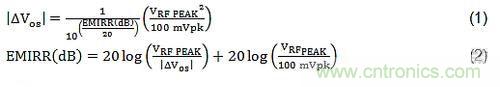 方程式(1)和(2)給出了EMIRR的數(shù)學定義。兩個方程式互為彼此的重置版本。方程式(1)展示了所用RF信號和偏移電壓的改變之間的關系。請注意所用RF信號的平方引起的偏移電壓變化。這意味著入射RF信號較小幅度的增加可導致偏移電壓的顯著增加。還請注意,術語EMIRR的作用是減弱RF信號的影響;換句話說,較大的EMIRR(dB)可使偏移電壓的變化大幅度減少。方程式(2)是在表征過程中用來計算EMIRR(dB)的方程形式。