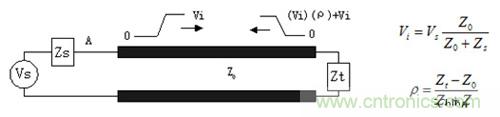 下圖描繪了加在長的傳輸線上的初始波形,初始的電壓Vi傳送到傳輸線上直到到達末端,Vi的幅度通過驅動器電阻和傳輸線阻抗的分壓來決定: