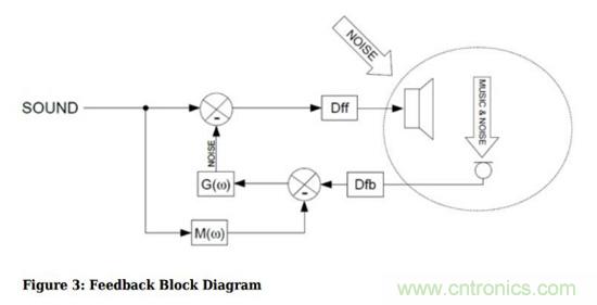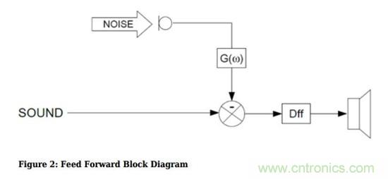 如果把系統(tǒng)畫成信號流圖,就是下圖,噪聲在麥克風采樣后進入信號處理電路,產(chǎn)生“反”噪聲,并與音樂一起送進耳機內(nèi)。這種模式稱為前饋有源噪聲消除。