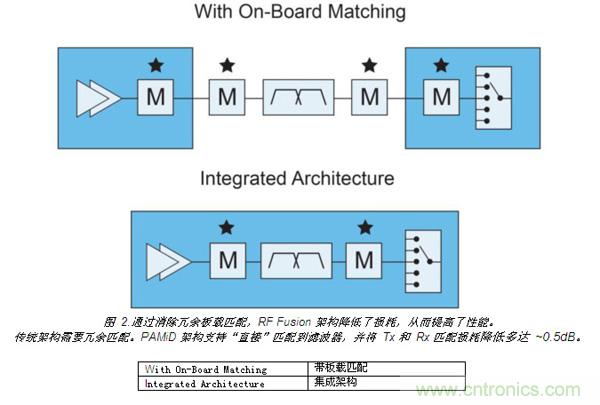 如圖 2 所示,每條通道上實(shí)現(xiàn)元件集成,無需對元件進(jìn)行板載匹配,從而提升了性能。這將發(fā)射和接收的匹配損耗降低多達(dá) 0.5 dB,進(jìn)而降低電流消耗和熱負(fù)荷。這種布局還在功率放大器的帶寬范圍內(nèi)集成相應(yīng)頻段的濾波器,確保了每個(gè)功率放大器能得到最高效的利用。每個(gè)模塊的改進(jìn)性能使制造商更容易實(shí)現(xiàn)手機(jī)的整體性能目標(biāo)。
