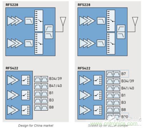 場景 1 制造商設(shè)計(jì)了一款采用 RF5422 多頻段 PA 模塊和 RF5228 高級發(fā)送模塊的中端手機(jī)。RF5422 提供所有必要的 3G 和 4G PA 功能;RF5228 為所有頻段提供 2G 支持和天線開關(guān)功能。針對中國市場,制造商添加了濾波器以支持 1、3、8、34、39、40 和 41 頻段。通過簡單添加頻段 7 和 20 的濾波器,即可針對歐洲的使用來對相同設(shè)計(jì)進(jìn)行擴(kuò)展。制造商可以在兩個(gè)區(qū)域使用相同的 PCB 設(shè)計(jì),并根據(jù)需要在 PCB 中添加濾波器。