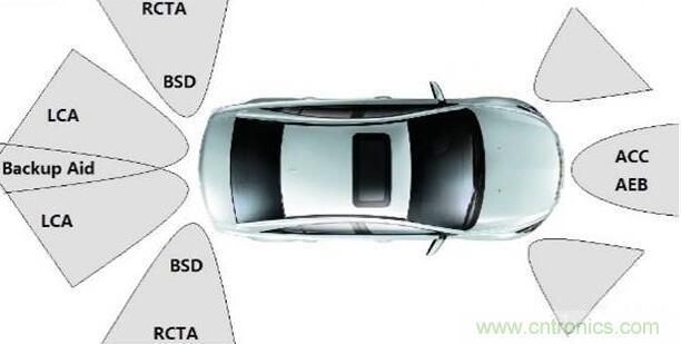 應用于汽車的防撞雷達一般工作在兩個頻段:24GHz-24.25GHz和76GHz-81GHz;工作在24GHz頻段的防撞雷達一般安裝在汽車后向,實現盲區監測(BSD),變道輔助(LCA)以及倒車側向警告(RCTA)等功能;工作在76GHz-81GHz頻段的毫米波防撞雷達一般安裝在汽車前向,用于實現自適應巡航(ACC),緊急制動(AEB)等功能。汽車防撞雷達不同功能覆蓋區域如圖1所示: