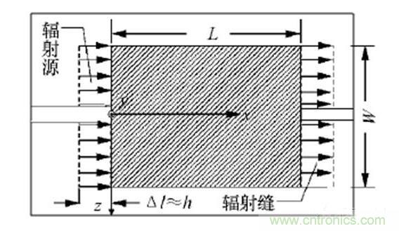 微帶貼片天線可看做一個場量在橫向沒有變化的開路諧振器[2],其輻射場由貼片長度方向兩側開路縫隙產生,如圖2所示