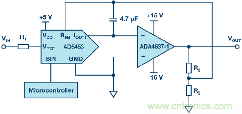 圖1顯示了一個帶下游放大器的14位MDAC AD5453 ,放大器可根據DAC的編程數字碼放大或削弱信號。