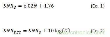 例如,要使抽取因子為2,必須讓信號的過采樣因子至少為2。在這個例子中,信號功率保持不變,但奈奎斯特帶寬被減半。這就消除了一半的噪聲功率,從而讓該ADC的SNR增加了3dB。第一個方程式表示因量化噪聲得到的理想SNR,其中N是該轉換器的位數(shù)。第二個方程式則表示與抽取因子D相關的SNR改善值。