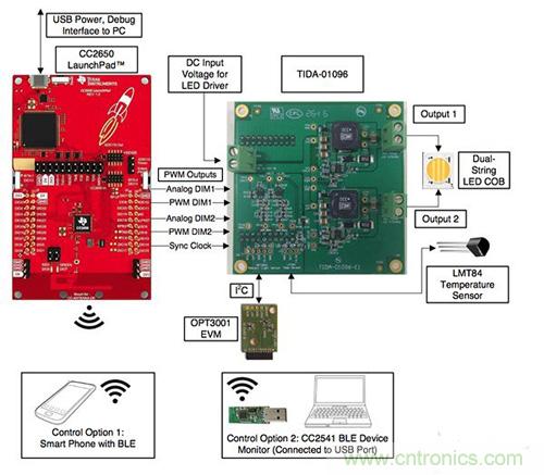 圖 5 顯示了如何使用與 SimpleLink CC2650 LaunchPad 配對的 TIDA-01096 來配置基于參考設計的 LED 照明解決方案的硬件。該項目的固件是由 TI 作為代碼調試器項目開發的,可根據要求提供。
