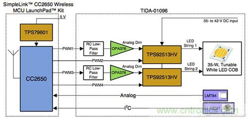 SimpleLink CC2650 無線 MCU 與 LED 驅動器緊密協作,提供了兩個關鍵功能:驅動器的控制信號,以及以無線方式影響這些信號的功能。這樣,便可以從智能手機上運行的應用程序中調節光輸出或色溫,或者允許 BMS 將燈關閉、打開、調亮或調暗 — 可能使用語音指令。