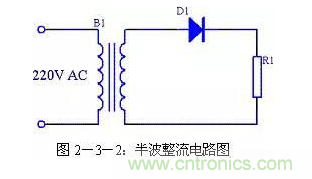 (1)半波整流電路半波整流電路見圖2-3-2。其中B1是電源變壓器,D1是整流二極管,R1是負載。B1次級是一個方向和大小隨時間變化的正弦波電壓,波形如圖 2-3-3(a)所示。0~π期間是這個電壓的正半周,這時B1次級上端為正下端為負,二極管D1正向導通,電源電壓加到負載R1上,負載R1中有電流通過;π~2π期間是這個電壓的負半周,這時B1次級上端為負下端為正,二極管D1反向截止,沒有電壓加到負載R1上,負載R1中沒有電流通過。在 2π~3π、3π~4π等后續周期中重復上述過程,這樣電源負半周的波形被“削”掉,得到一個單一方向的電壓,波形如圖2-3-3(b)所示。由于這樣得到的電壓波形大小還是隨時間變化,我們稱其為脈動直流。
