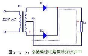 由圖2-3-13可以看出在電源正半周時,B1次級上端為正,下端為負,整流二極管D4和D2導通,電流由變壓器B1次級上端經過D4、R1、D2回到變壓器B1次級下端;由圖2-3-14可以看出在電源負半周時,B1次級下端為正,上端為負,整流二極管D1和D3導通,電流由變壓器B1次級下端經過 D1、R1、D3回到變壓器B1次級上端。R1兩端的電壓始終是上正下負,其波形與全波整流時一致。