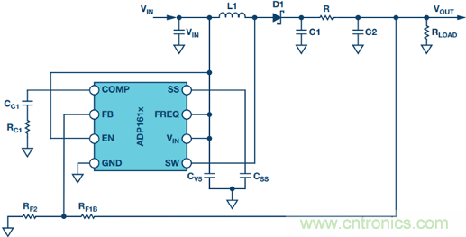 圖3. 在輸出端添加RC濾波器的ADP161x低輸出電流升壓轉換器設計