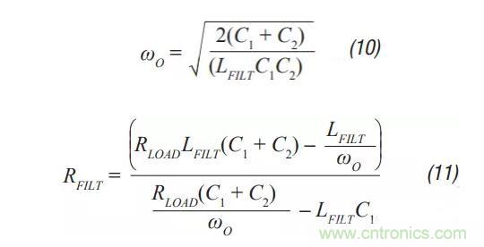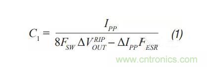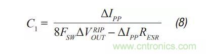 第1步:正如之前的拓撲,選擇C1,使其等于沒有輸出濾波器時的情況。10 mV p-p至100 mV p-p是個不錯的開始,具體取決于最終目標輸出紋波。C1隨后可通過公式8計算得出。C1在這個拓撲中可以采用比之前拓撲更小的數值,因為濾波器效率更高。