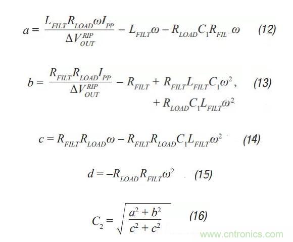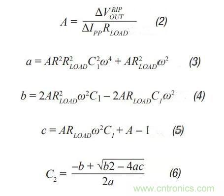 第3步:C2隨后可通過公式2至公式6計算得出。A、a、b和c是簡化計算的中間值,沒有實際意義。這些公式假定R < />LOAD,且每個電容的ESR較小。這些都是很好的假設,引入的誤差很小。C2應等于或大于C1。可調節第1步中的紋波,使其成為可能。