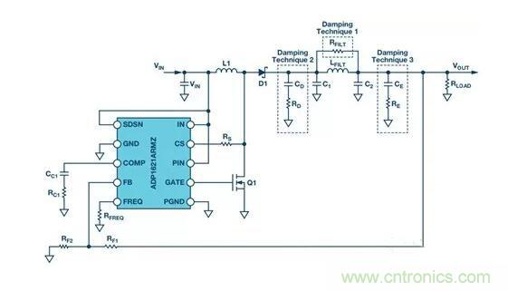圖4. 采用輸出濾波器并突出多種不同阻尼技術的ADP1621