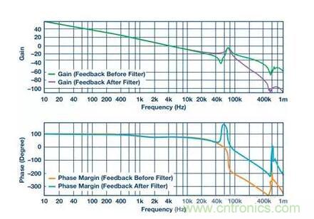 需注意的另一個問題是補償。盡管這可能不符合直覺,但把濾波器放在反饋環路內部幾乎一直都是更好的做法。這是因為,將其放在反饋環路內有助于在一定程度上抑制濾波器,消除直流負載偏移和濾波器的串聯電阻,同時能提供更好的瞬態響應、更低的振鈴。圖5顯示了一個升壓轉換器的波特圖,其在輸出端添加了LC濾波器輸出。
