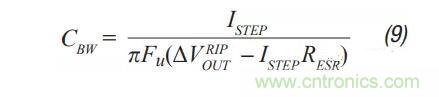 第3步:如前所述,添加濾波器會影響轉換器補償,具體表現為降低可實現的交越頻率(Fu)。根據公式7的計算,對于電流模式轉換而言,可實現的最大Fu是開關頻率的1/10以下,或者是濾波器FRES的1/5以下。幸運的是,大部分模擬負載不需要太高的瞬態響應。公式9計算轉換器輸出所需的輸出電容近似值(CBW),以提供指定的瞬態電流階躍。