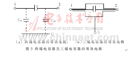一般情況下,電阻、電感和電容等電子元件均被看作雙端元件。兩端電容器的等效電路示如圖3(a)。由于各端鈕對附近導電物體的分布電容C1G、C2G是變化的,