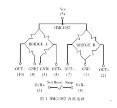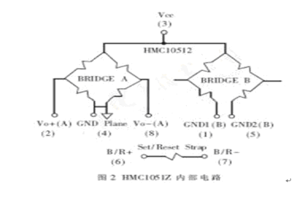 HMC1051Z為HMC1052的單軸版本,其參數與HMC1052相同。HMC10512內部電路如圖2所示。