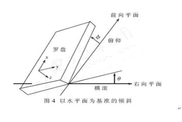 將不可能保證其永遠水平,所以在這種場合下,羅盤的可使用性大大降低。于是需要設計三維羅盤以適應各種姿態的測量。三維電子羅盤的總體設計方案如圖3所示。三軸磁阻傳感器分別從X、Y、Z 三個磁場強度方向輸出電壓,經過放大電路分別輸入到三個具有A/D轉換能力的MCU端口,二軸加速度傳感器測量俯仰角度和橫滾角度,測量參數的意義如圖4所示。