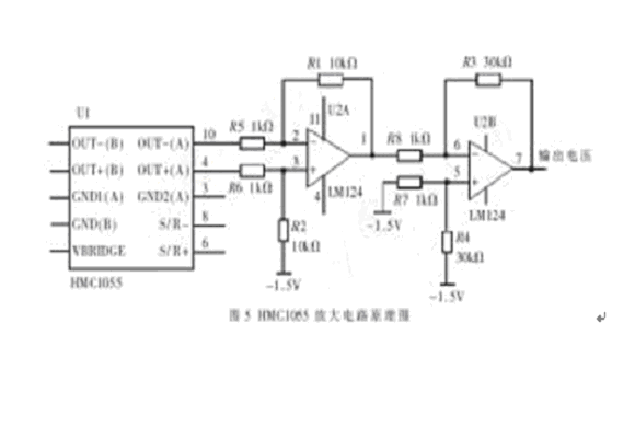 各向異性磁阻(AMR)傳感器由惠斯頓電橋進行工作,并且傳感器輸出電壓很小,需要放大才能進行A/D轉換。下面以HMC1052為例進行分析。HMC1052的靈敏度為±1.0mV/V/高斯,