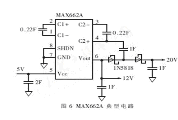 個3~4A的最小脈沖驅動一個6Ω的負載所需的供電電壓為18V~24V。由于系統芯片都是使用5V電源,所以需要將5V電壓升壓到20V左右,可以使用MAX662來完成。典型的電路如圖6所示。