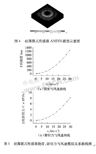 為了方便軟件模擬,簡化了所設計傳感器的模型。薄膜的厚度取10μm,2000 μm×2000μm的正方形,空腔的厚度取330μm。圖4為帶有薄膜形變的ANSYS模型。薄膜的模型用Solid45,流體模型應用FLUID142,風速從0~30 m/s間隔變化。通過模擬得到了薄膜最大形變、最大應力與風速的關系曲線,見圖5。分析模擬所得的數據,可知薄膜撓度和剪切力都與風速成二次關系,與薄膜式傳感器的理論分析相一致。