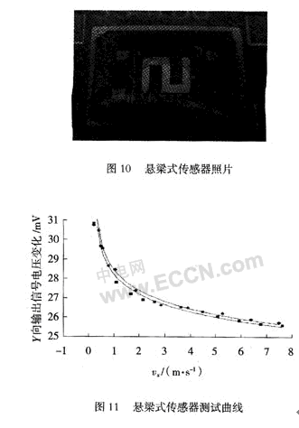 依據所設計的原理及工藝流程,首先制作了懸梁式測風傳感器如圖10所示。傳感器為雙懸梁結構,通過惠斯通電橋輸出傳感器測量信號,其測試圖如圖11所示。