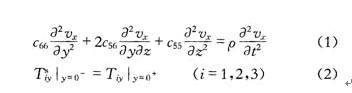 與淺體聲波一樣,表面橫波也是SH型聲表面波,只有平行于晶體表面單一的質點振動方向。因此可以假定表面橫波在晶體表面沿著Z方向傳播,質點在X方向振動。克里斯托夫方程及晶體表面的邊界條件可表示為