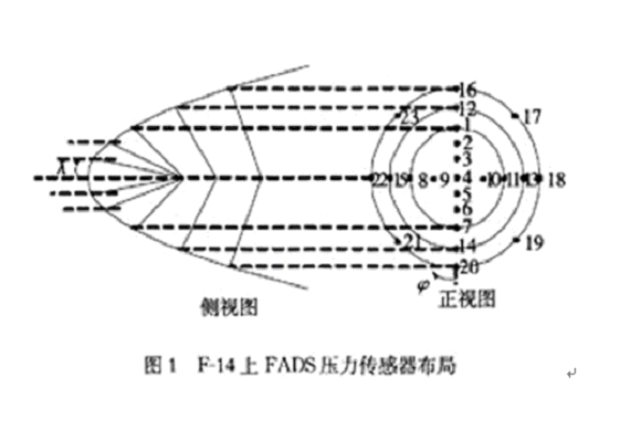 FADS一般安裝在飛行器前端,為了不影響雷達和火控裝置的安裝,也有將FADS安裝在機翼前端。F-14的FADS由23個壓力傳感器組成,安裝在機身前端。X-33的FADS系統則由6個壓力傳感器組成,安裝在機身前端。壓力傳感器的數目并沒有固定的規定。在F-14飛機上,其FADS的壓力傳感器布局如圖1所示。